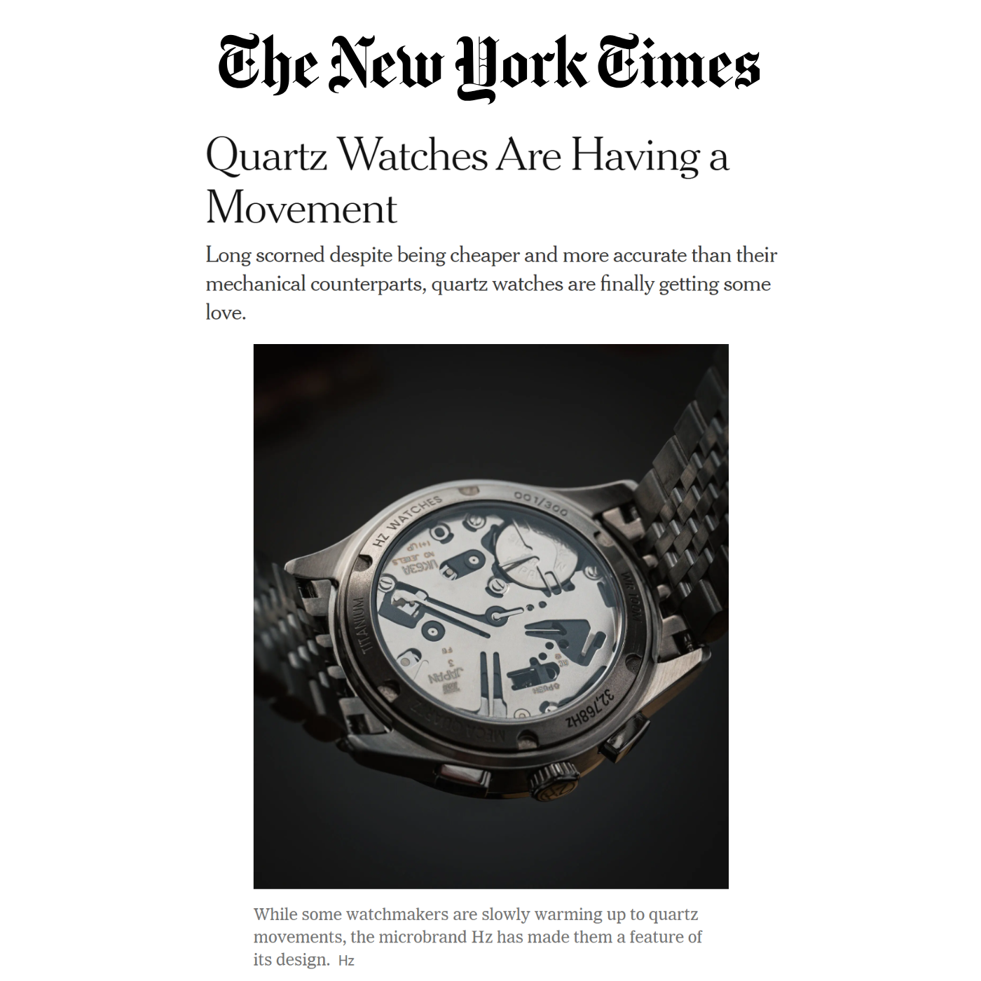 "This year, Mr. Zillmann’s initial production run of 300 watches sold out within 48 hours. He has now sold about 1,100 units of his original watch, the HZ.01, to consumers in 60 countries, and he recently began accepting preorders for a second watch — a chronograph called the HZ.02. Like its predecessor, the chronograph is a watch that is proud to be quartz — and wants the world to know it."